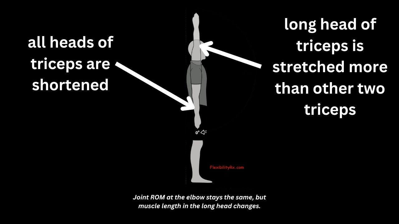 But if the arm is raised above the head while the elbow is still at 0º (straight elbow), the long head of the triceps—the one that attaches to the shoulder blade—will lengthen to increase its ROM into the stretched position (while the other two triceps will remain the same length):